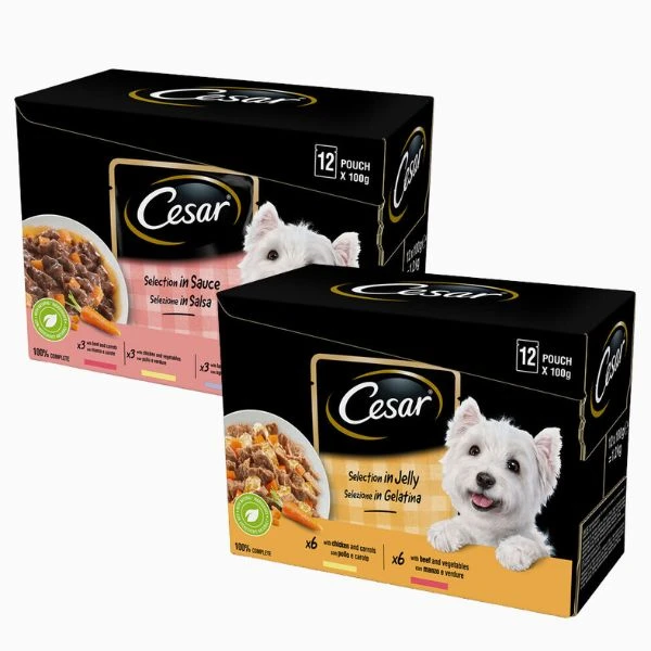 Cesar® ha ideato un’intera gamma di bustine Selezione del Giorno per dare al tuo cane un pasto completo di proteine, vitamine e minerali con un gusto eccezionale. Tutte le ricette Cesar® sono senza aromi, coloranti e conservanti artificiali. Acquista il formato convenienza Multipack 12×100 g.
