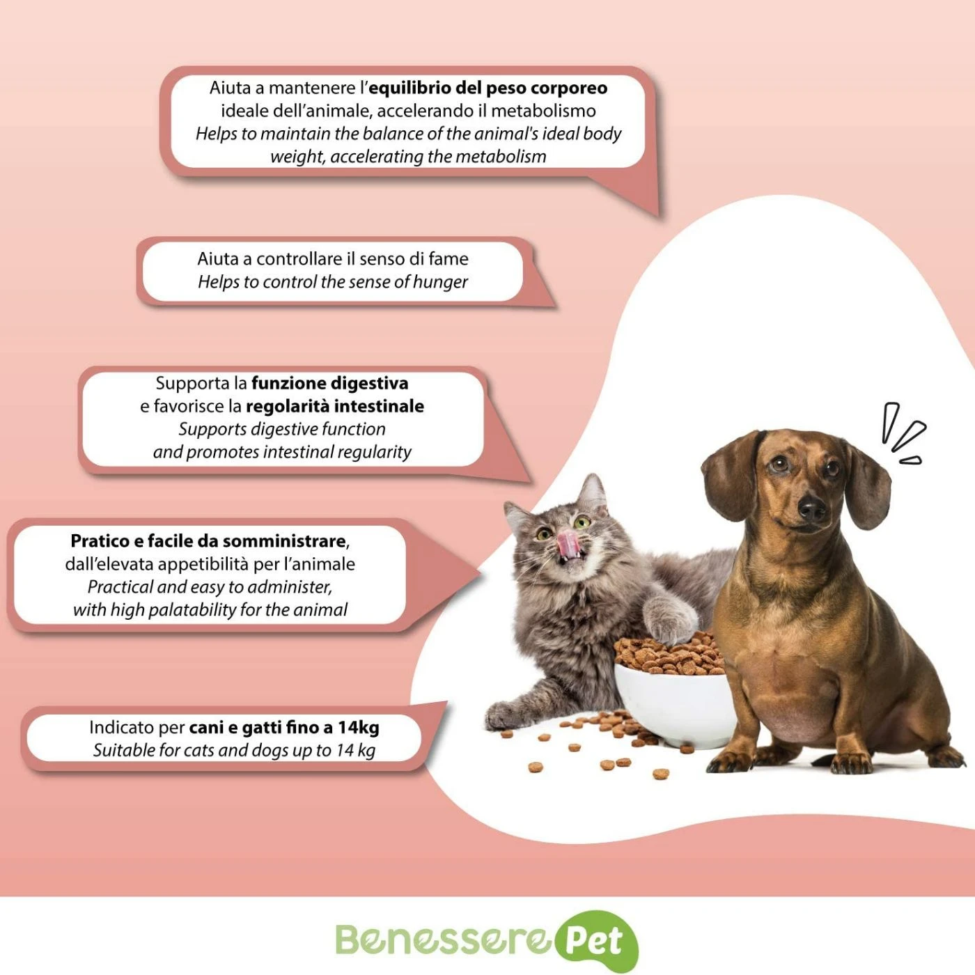Prodotto studiato per supportare il mantenimento dell’equilibrio del peso corporeo di cani e gatti.