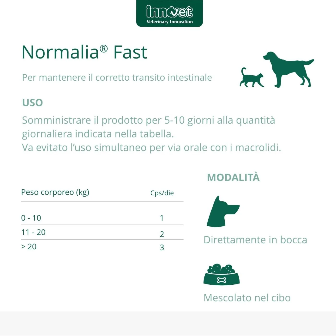 Innovet Normalia® Fast Integratore per Cani e Gatti 10 Compresse, utile per la riduzione dei disturbi acuti dell’assorbimento intestinale nel cane e nel gatto (es. diarrea acuta da indiscrezione alimentare) e i successivi periodi di convalescenza.