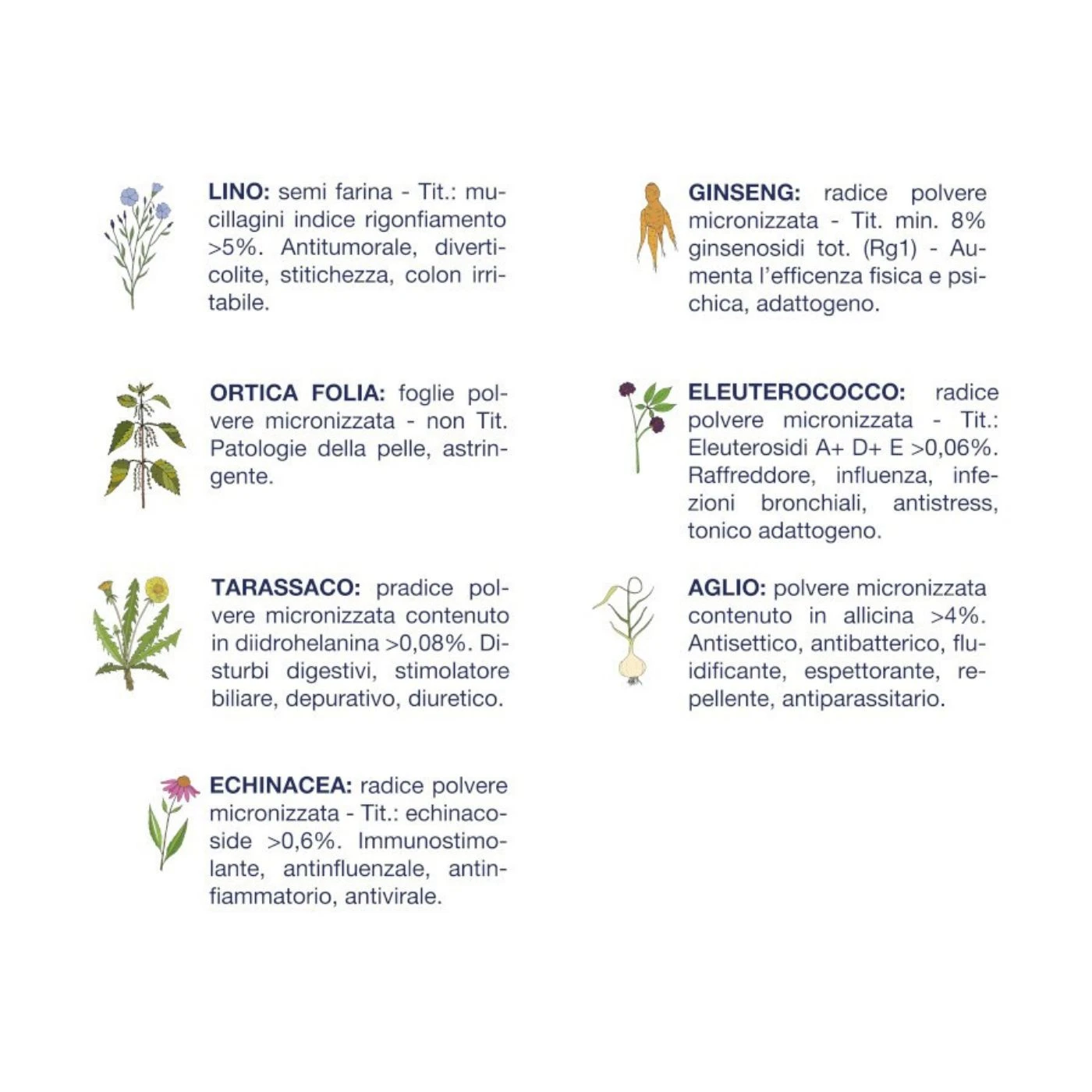 erbe officinali 0,5% (Lino, Ortica folia, Tarassaco, Eleuterococco, Echinacea, Ginseng, Aglio)